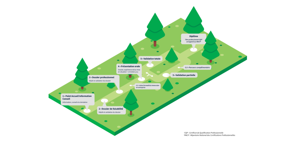 La première étape consiste à identifier la certification la plus adaptée aux compétences développées par le candidat au cours de son parcours professionnel. Un premier rendez-vous sur une Permanence d’Accueil, d’Information et de Conseil (PAIC) peut permettre d’être accompagné dans cette réflexion, sans engagement.